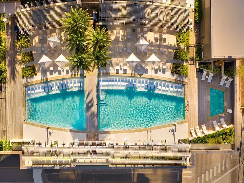 Wellness and leisure are front and center with a full-service spa, 24/7 fitness center, and a rooftop pool and hot tub perfect for soaking up the sun or enjoying evenings under the city lights. Whether you’re winding down or gearing up for a night out, the hotel offers everything you need for a memorable stay.