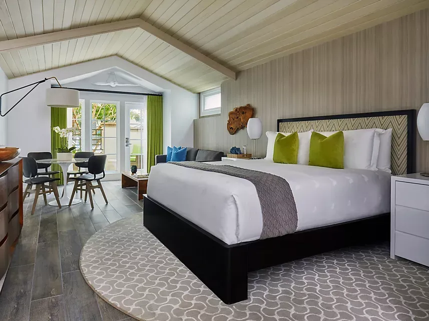 Accommodations range from stylish guest rooms in the mid‑century Ocean Tower and the classic Palisades Wing, to private 1930s bungalows set among the gardens. Some bungalows sleep up to eight guests, making them perfect for group getaways or special celebrations. The interiors blend relaxed beach-vibes with luxury touches like Le Labo bath products, work desks, plush robes, and private patios.