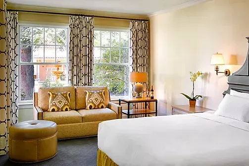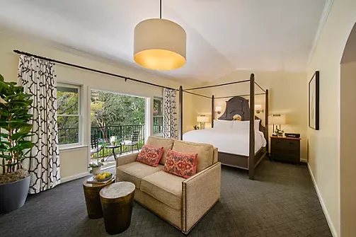 Accommodations range from cozy rooms with garden views to romantic suites with fireplaces, Jacuzzi tubs, and spacious sitting areas. Whether you’re traveling solo, as a couple, or with family, the rooms offer classic Wine Country elegance with modern comforts like Le Labo toiletries, plush robes, and private patios or balconies.